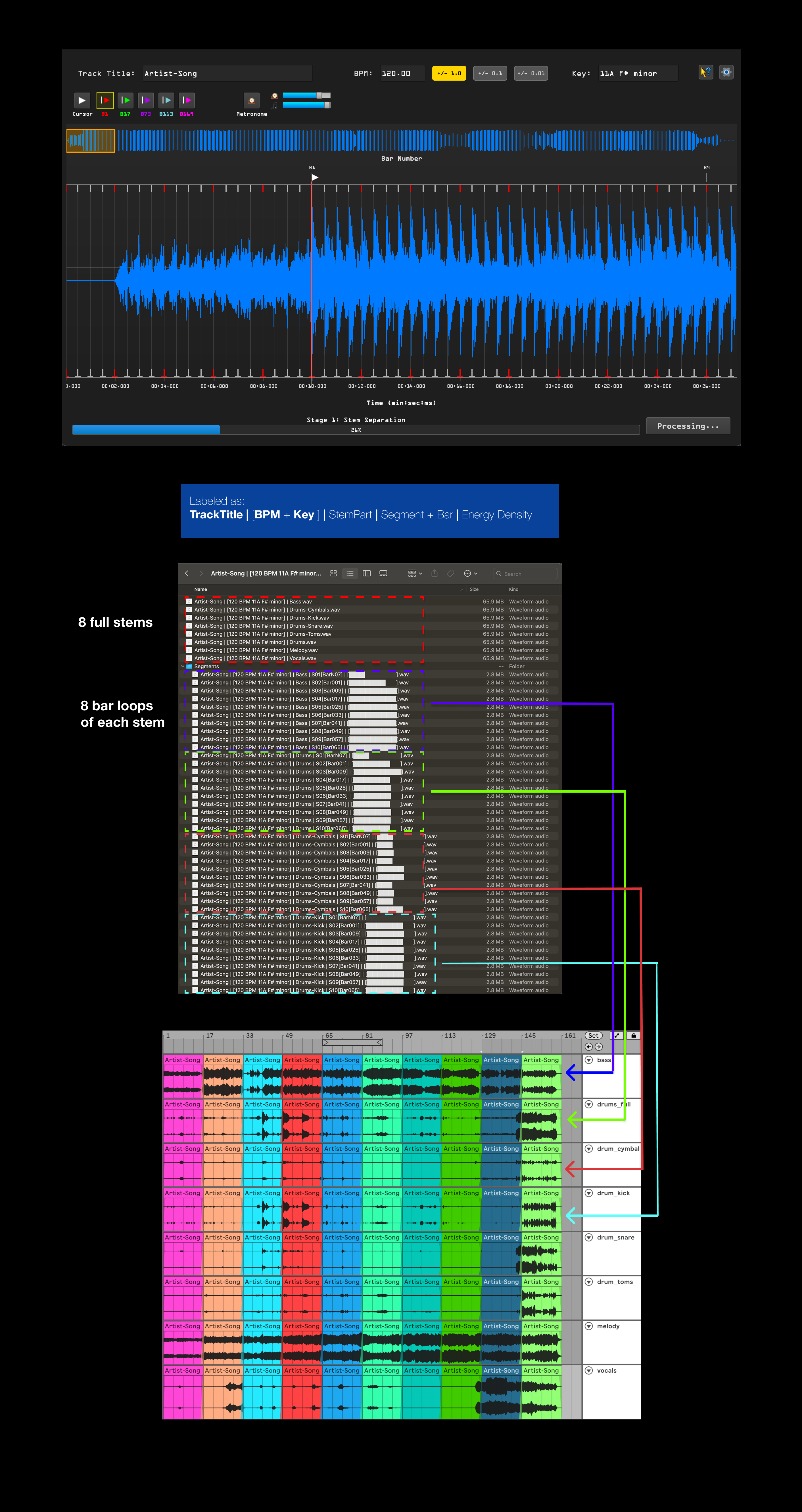 Drag any song into Qie and use it's optimized GUI (faster than any DAW) to find the exact BPM of your song within seconds to perfectly grid your track. Hit the Process Audio button then create perfect 8 bar loops (labeled by BPM and Key) from your favorite songs.